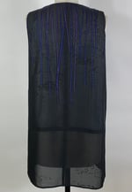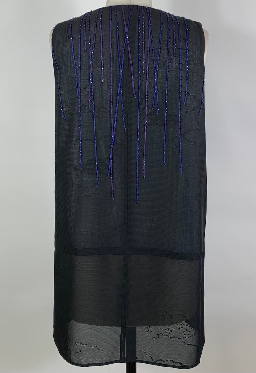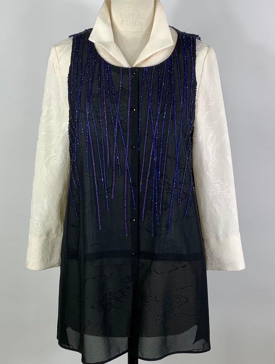 A sheer black kimono silk vest hand appliquéd with dark blue and purple narrow strips. Glass beads were hand stitched to add sparkle and glitter.