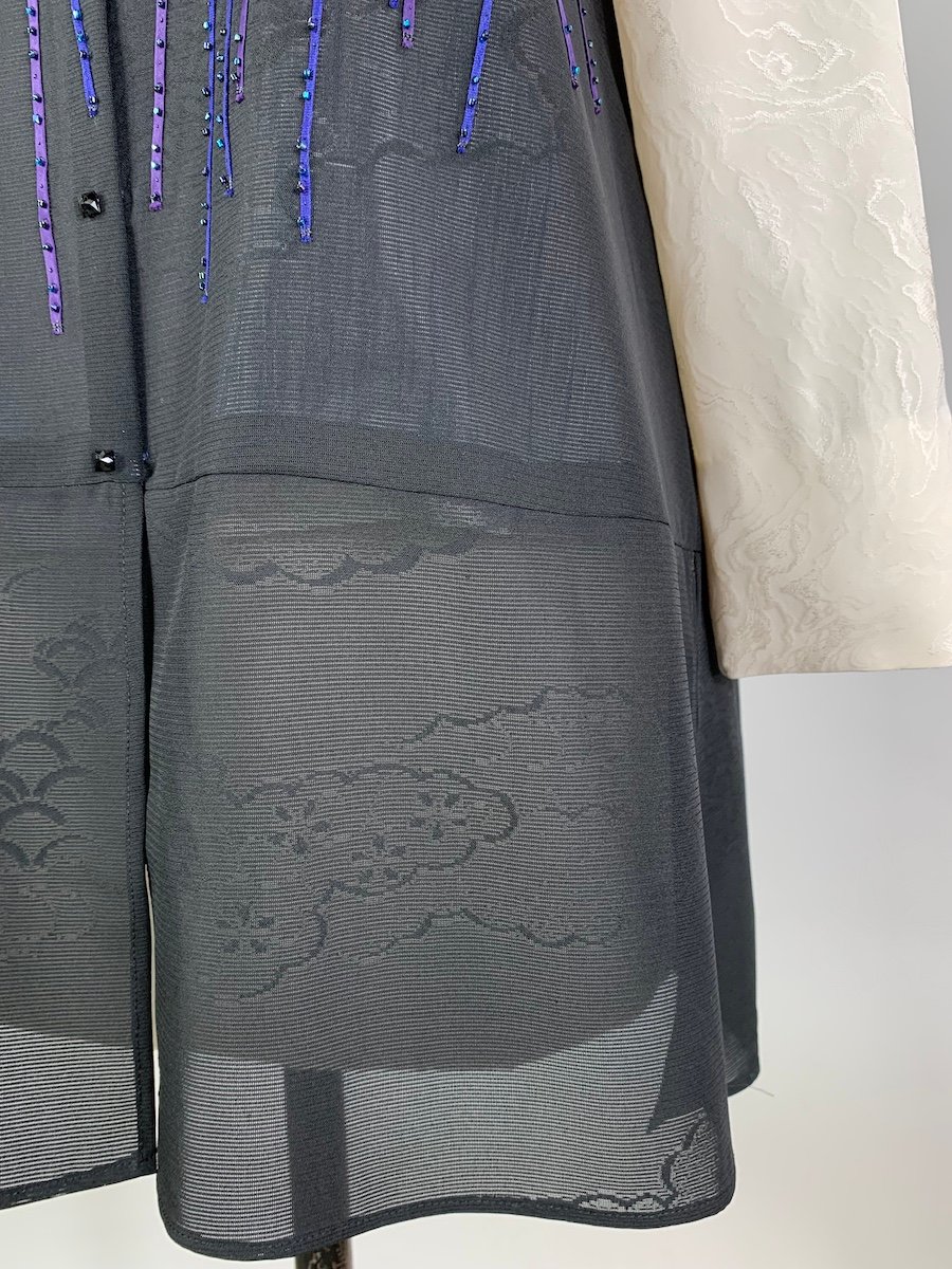 The sheer black has a woven design of clouds. It is lined to about hip level with a hand painted striped silk charmeuse in blue. The panel along the bottom is not lined to emphasize the see-through quality of the fabric. The panel has slits along the sides.