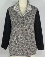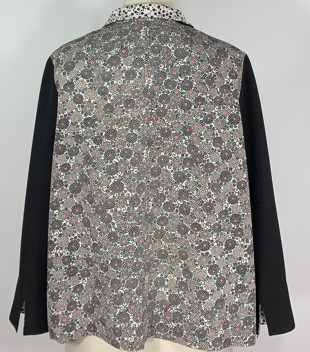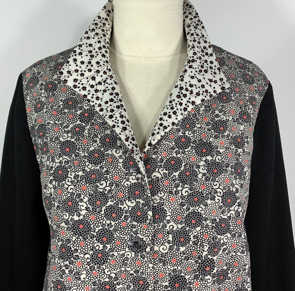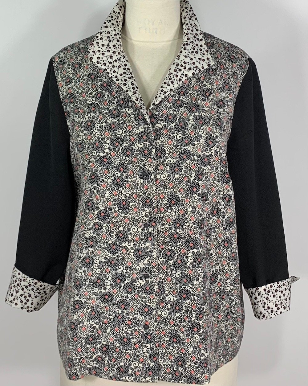 Sewn from a beautiful vintage kimono silk with a design of small black 'kick' or, chrysanthemums, with red centers. The open collar shows a black and white silk with tiny cherry blossoms with their own small red centers. The contrasting black sleeves can be rolled up to reveal the same fabric used inside the collar. 5 black glass buttons line the front.