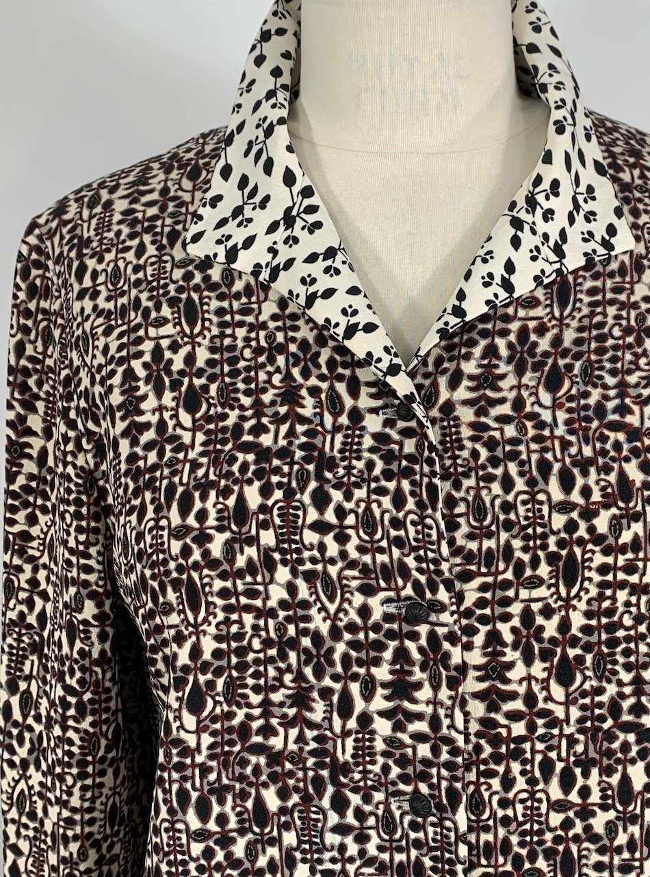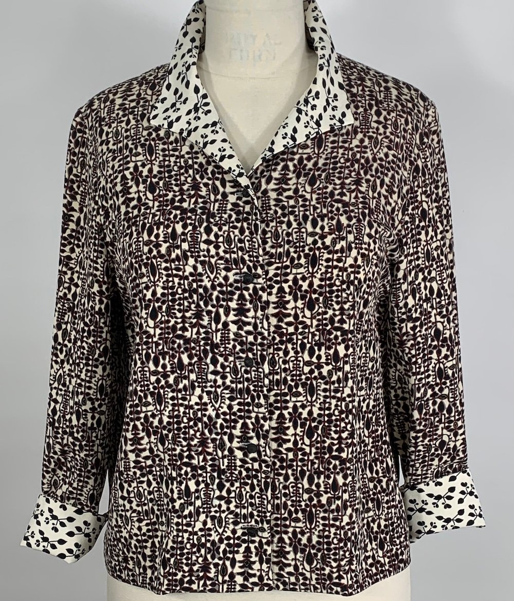 A loose fitting, straight sided top, I call this design 'hitoe,' which means unlined. This versatile top can be worn on its own, like a blouse, or over something else like a light weight jacket. It is sewn from a beautiful kimono silk with a design of small abstracted plants, leaves and flowers in white, black and bits of deep red. The collar is a white silk with black leaves and blossoms. The sleeves can be rolled up to reveal the same silk as the collar. 5 vintage glass buttons line the front.