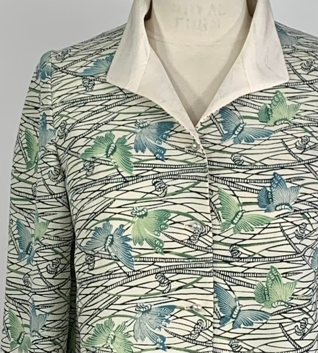 A loose fitting, straight sided top, I call this design 'hitoe,' which means unlined. This versatile top can be worn on its own, like a blouse, or over something else like a light weight jacket. It is sewn from a beautiful cream colored Japanese kimono silk with a design of green and blue butterflies with stylized navy colored grasses behind. The cream colored collar is woven with a design of pine needles. The sleeves can be rolled up to reveal the same silk as the collar. 5 pearl colored buttons line the front.