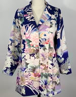 A one of a kind, vintage, Japanese kimono silk, trench coat. An amazing design of a dense garden with peonies, chrysanthemums, iris and cherry blossoms and a variety of birds scattered through out. All rendered in a deep blue background with pinks, peach, lavender and greens. There are angled pockets on the front. It can be worn with or without its matching belt. Fully lined with silk charmeuse. 4 glass buttons line the front.