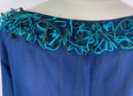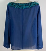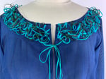 A loose fitting, boat neck jacket with straight sides. Sewn from a sheer kimono silk woven with subtle waving vertical lines. Turquoise and deep green narrow bias tubes of silk are looped and stitched around the collar band in a three dimensional decorative edge. A piece of the turquoise is used as a tie to hold the jacket closed. This top could be worn over a camisole or a tank top, a long sleeved or a turtle neck tee-shirt.