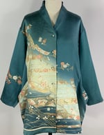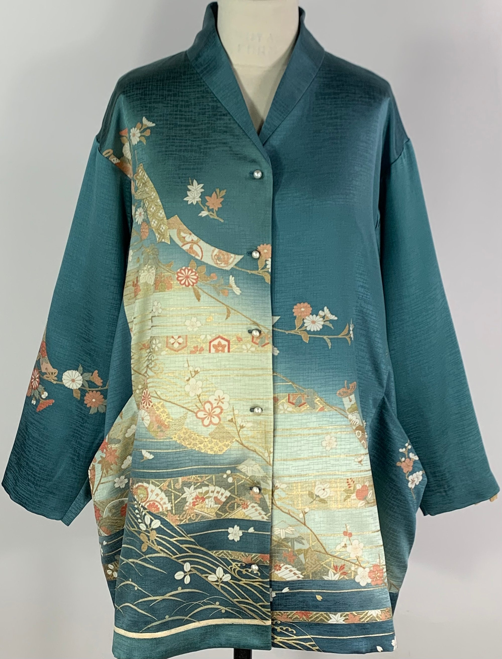 Sewn from beautiful vintage silk kimono. The soft teal colored base has a diagonal design of golden flowers, fans and strips of paper blowing gently in the breeze. This is a full, roomy jacket, I call it 'oversize.' There are angled pockets at the sides. Fully lined with silk charmeuse. Six glass buttons line the front. One size fits most.