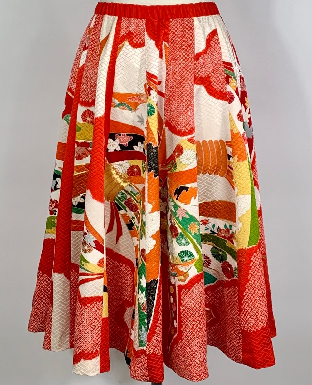 A full gored skirt sewn from a vintage Japanese kimono. Photos show the skirt with a crinoline underskirt and without.