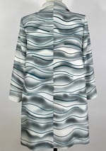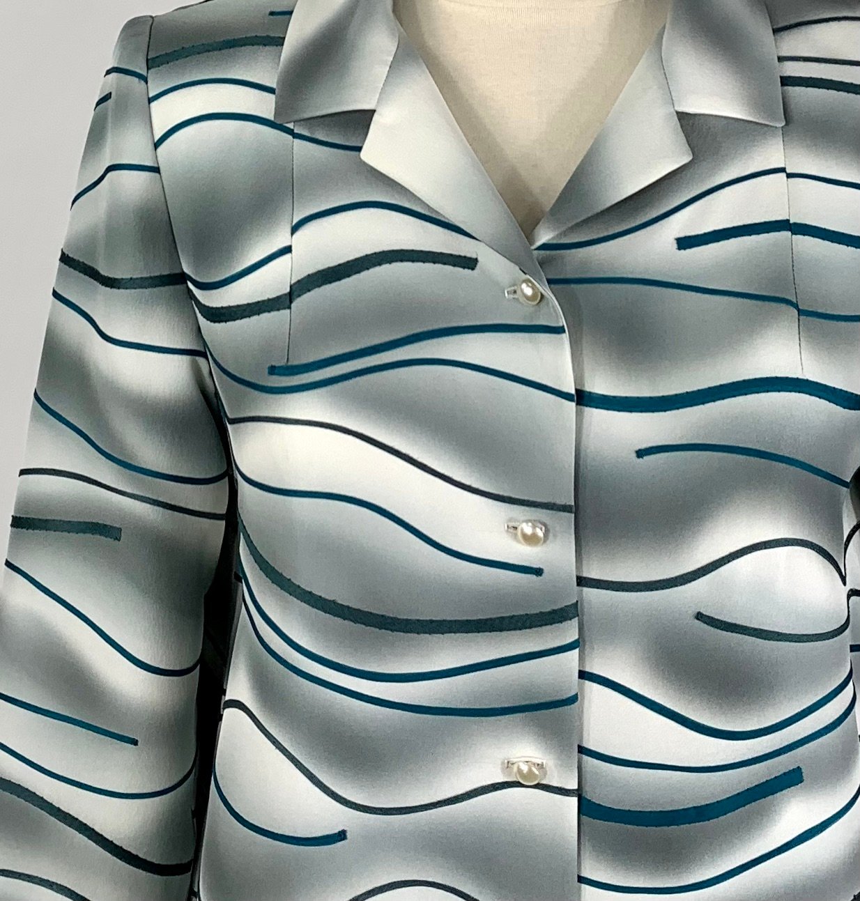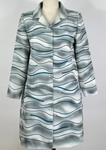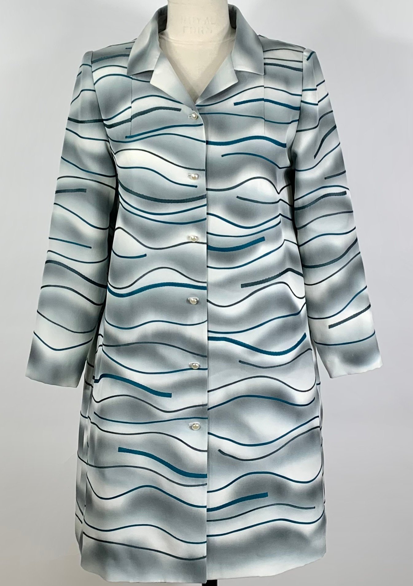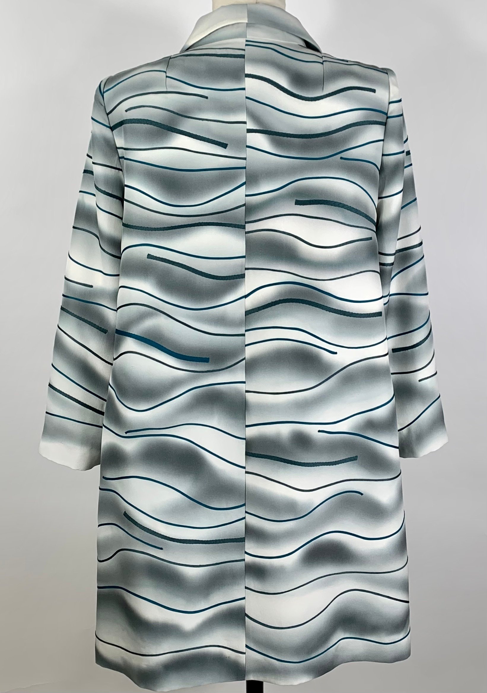 A one of a kind coat sewn from a vintage painted kimono silk. Gentle wave-like brush strokes in a silvery pewter are echoed with appliquéd strips in a deep teal blue. There are pockets in the side seams. Fully lined with silk charmeuse. 5 vintage glass buttons line the front.