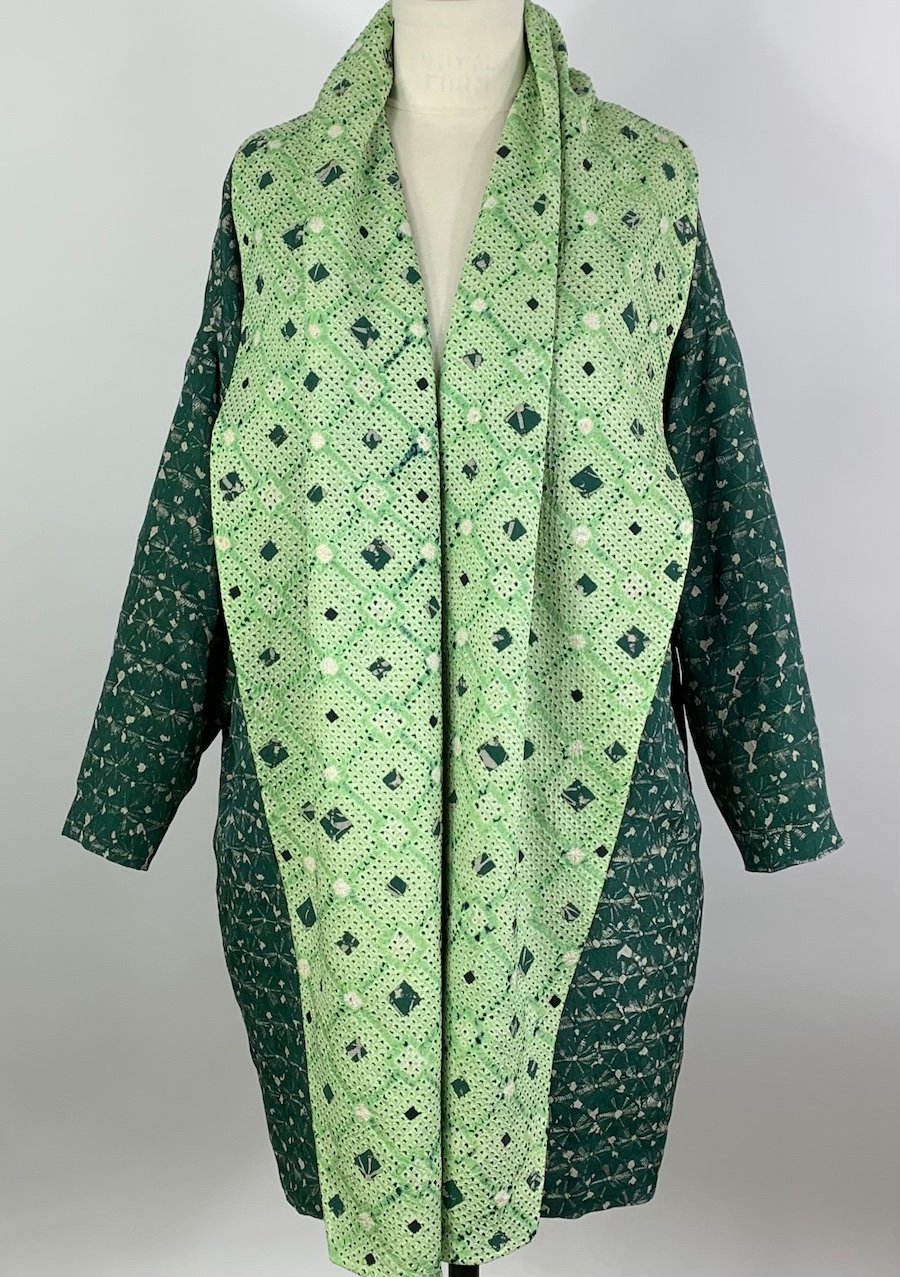 A loose coat sewn from 2 vintage Japanese silk shibori fabrics. Shibori is Japanese tie-dye.