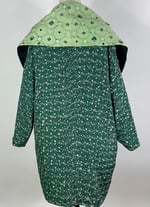 The full collar can be spread out over the shoulders or folded in tight around the neck, like a shawl. There are pockets in the front under the collar. There is a dark green lining the collar and under the sleeves. The coat is fully lined with silk charmeuse.