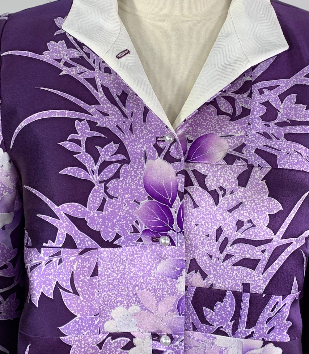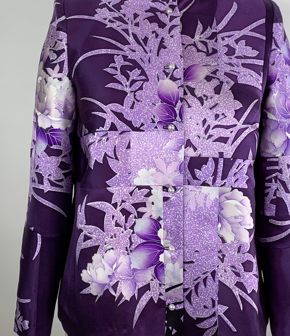 A one of a kind jacket pieced with silk from a vintage Japanese kimono. Small remnant pieces of the kimono were rearranged into a new design. 6 vintage buttons line the front. The jacket is fully lined with silk charmeuse. A classic straight sided shape, I call this style 'Chanel'.