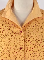 A loose fitting, straight sided top, I call this design 'hitoe,' which means unlined. This versatile top can be worn on its own, like a blouse, or over something else like a light weight jacket. It is sewn from a beautiful Japanese kimono silk with a design of sunny yellow circles on a red background. The collar is a yellow silk woven with circle shapes. The sleeves can be rolled up to reveal the same silk as the collar. 5 vintage glass buttons line the front.