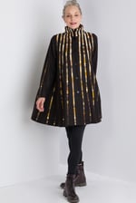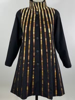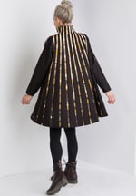 Black wool swing coat sewn with narrow strips of pieced gold silks. Every color in the strips is a separate piece of fabric.