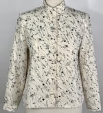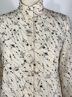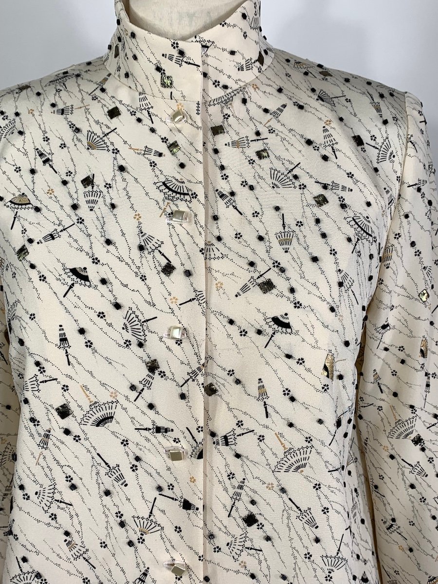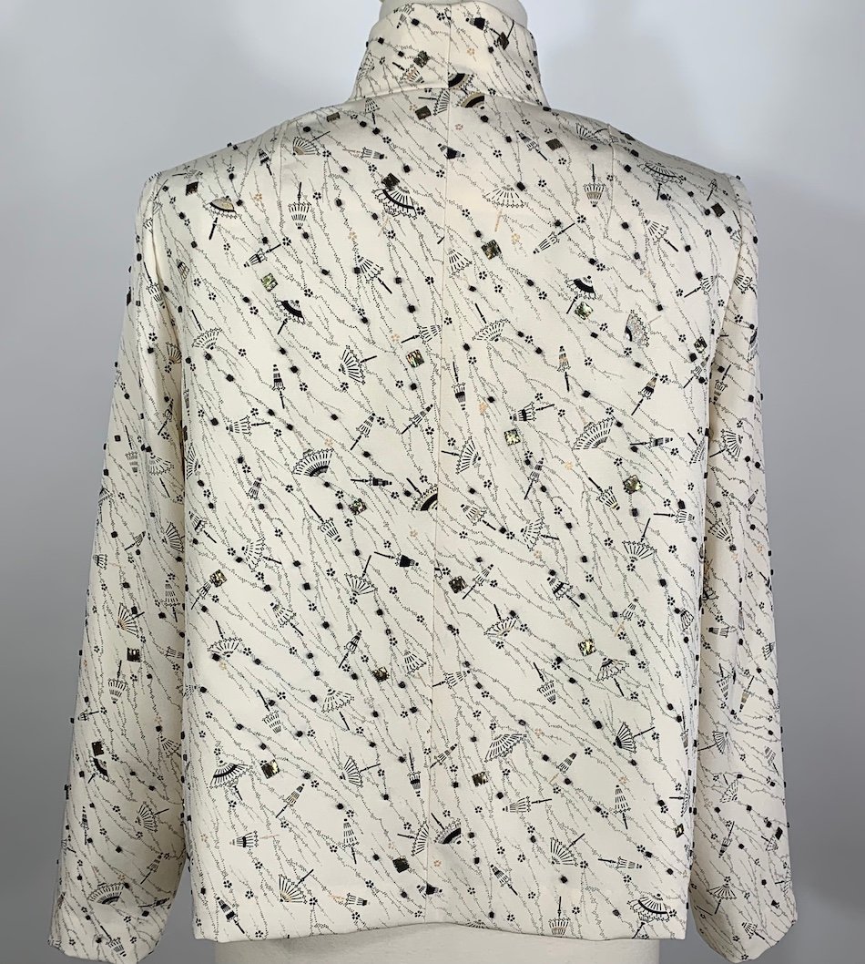 A one of a kind jacket sewn from a vintage Japanese kimono silk. A black on cream print of umbrellas and delicate tendrils of flowers. Little bits of a metallic gold are added for sparkle. I've sewn on square glass beads and appliquéd small gold squares over the front, back and sleeves, 6 vintage glass buttons line the front. The jacket is fully lined with silk charmeuse. A classic straight sided jacket, I call this style 'Chanel'.